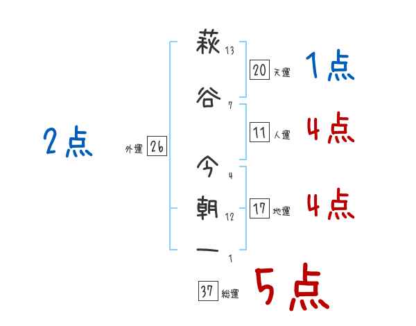 外運![]() | 萩谷今朝一さんの外運は26画の2つ星!波瀾万丈かも。信頼できる人を大事にしましょう。 生活面を象徴する運勢です。外部から受ける影響力を表し、結婚運、家庭運や職場、環境への順応性を表します。 |