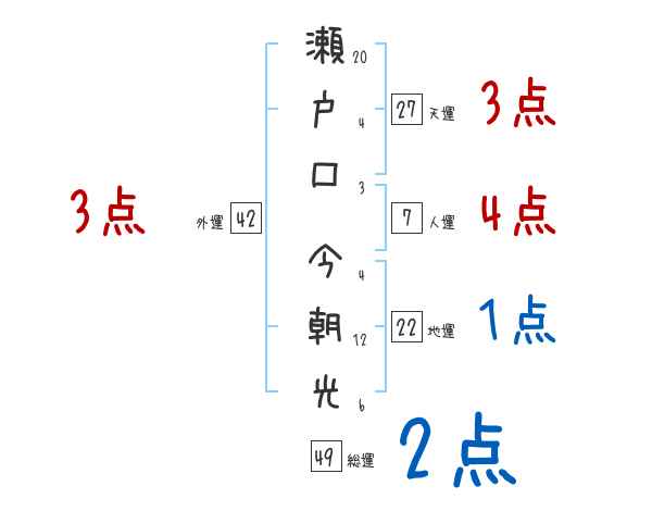 | 外運  | 瀬戸口今朝光さんの外運は42画の3つ星!病気に注意。多芸であるが消極的でおとなしい。生活面を象徴する運勢です。外部から受ける影響力を表し、結婚運、家庭運や職場、環境への順応性を表します。 |