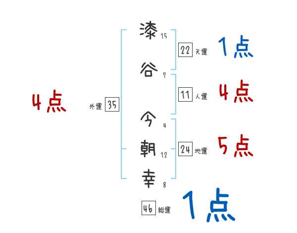 外運![]() | 漆谷今朝幸さんの外運は35画の4つ星!温厚な性格で感受性が高い。穏和な性格で人望が厚い。 生活面を象徴する運勢です。外部から受ける影響力を表し、結婚運、家庭運や職場、環境への順応性を表します。 |