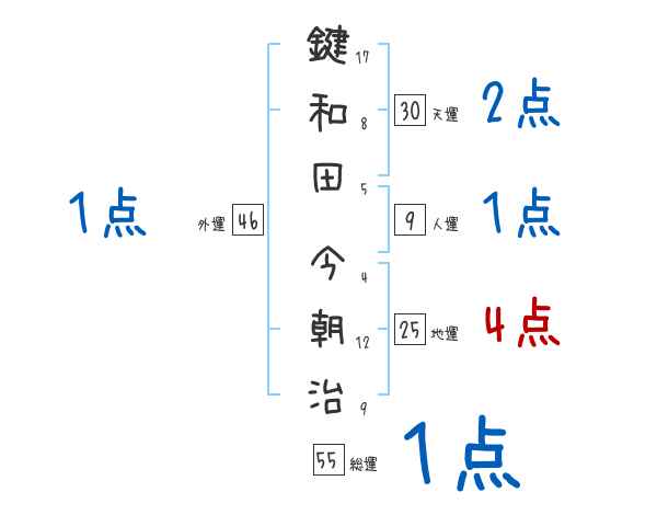 鍵和田今朝治さんの画数の鑑定結果