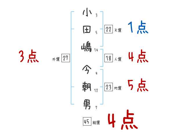 外運![]() | 小田嶋今朝男さんの外運は27画の3つ星!頭脳明晰だが強情で摩擦が多い傾向。孤立に注意。 生活面を象徴する運勢です。外部から受ける影響力を表し、結婚運、家庭運や職場、環境への順応性を表します。 |