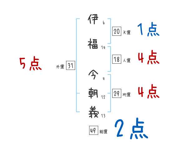 地運![]() | 伊福今朝義さんの地運は29画の4つ星!完全主義で才能がある。厳格な心の持ち主。 個性を表す基礎的な運勢です。性格形成や対人関係、行動力など家庭環境に影響されます。主に誕生してから20歳くらいまでの若年期の運勢を表します。 |