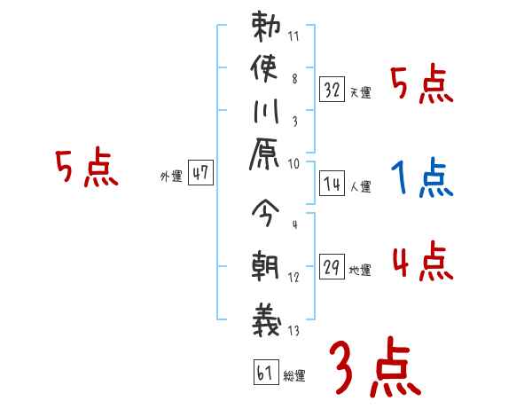 天運![]() | 勅使川原今朝義さんの天運は32画の5つ星!柔軟性があり成功する。チャンスが多く金運が良い。 家系が持つ宿命的な運勢を表します。祖先から受け継いだ苗字ですので自分の力が及びません。家柄を象徴します。 |