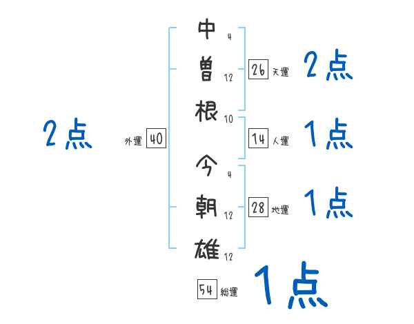 総運![]() | 中曽根今朝雄さんの総運は54画の1つ星!トラブルが多いかも。周りをよく見て協調して過ごしましょう。 あなたの人生を表す1番重要な運勢です。生涯を通じて影響する総合運となり、主に50歳以降の晩年期に影響を及ぼします。 |
