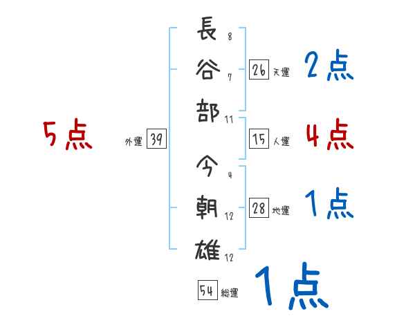 外運![]() | 長谷部今朝雄さんの外運は39画の5つ星!社交性に優れ人望が厚い。人の上に立ち成功する。 生活面を象徴する運勢です。外部から受ける影響力を表し、結婚運、家庭運や職場、環境への順応性を表します。 |