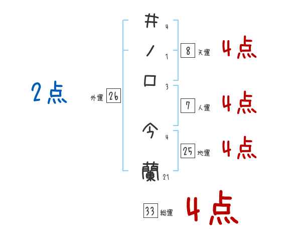 外運![]() | 井ノ口今蘭さんの外運は26画の2つ星!波瀾万丈かも。信頼できる人を大事にしましょう。 生活面を象徴する運勢です。外部から受ける影響力を表し、結婚運、家庭運や職場、環境への順応性を表します。 |