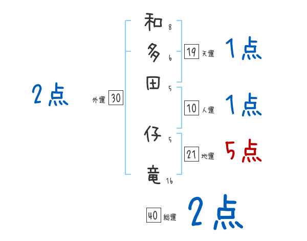 総運![]() | 和多田仔竜さんの総運は40画の2つ星!自信過剰で物事に固執するためトラブルに注意。 あなたの人生を表す1番重要な運勢です。生涯を通じて影響する総合運となり、主に50歳以降の晩年期に影響を及ぼします。 |