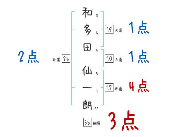 総運![]() | 和多田仙一朗さんの総運は36画の3つ星!先見性が豊かです。多少神経質で苦労することも。 あなたの人生を表す1番重要な運勢です。生涯を通じて影響する総合運となり、主に50歳以降の晩年期に影響を及ぼします。 |