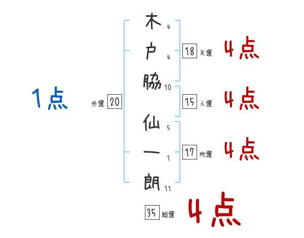 天運![]() | 木戸脇仙一朗さんの天運は18画の4つ星!情熱的で剛気。忍耐力があり信頼される。 家系が持つ宿命的な運勢を表します。祖先から受け継いだ苗字ですので自分の力が及びません。家柄を象徴します。 |