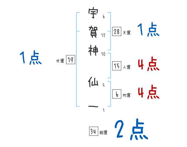 総運![]() | 宇賀神仙一さんの総運は34画の2つ星!独創性に優れるが、自尊心が強く災難に注意しましょう。 あなたの人生を表す1番重要な運勢です。生涯を通じて影響する総合運となり、主に50歳以降の晩年期に影響を及ぼします。 |