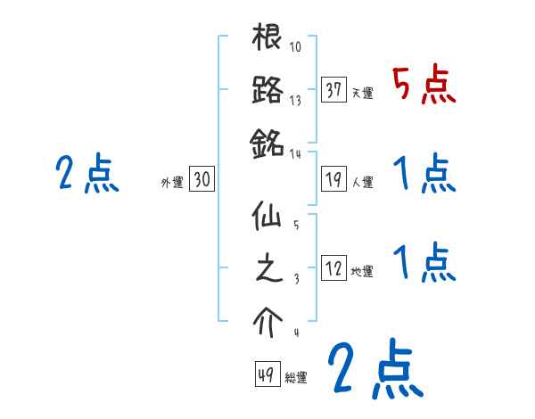 総運![]() | 根路銘仙之介さんの総運は49画の2つ星!不安定な性格で明暗がある人生。周りの人には支援されやすい。 あなたの人生を表す1番重要な運勢です。生涯を通じて影響する総合運となり、主に50歳以降の晩年期に影響を及ぼします。 |