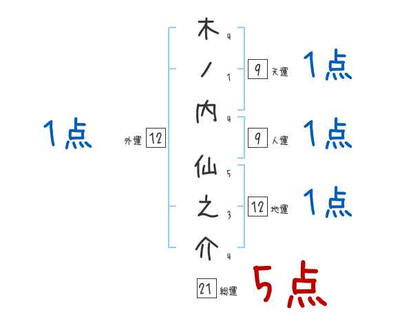 天運![]() | 木ノ内仙之介さんの天運は9画の1つ星!消極的で才能を発揮することが苦手なことも。周りの意見に耳を傾けましょう。 家系が持つ宿命的な運勢を表します。祖先から受け継いだ苗字ですので自分の力が及びません。家柄を象徴します。 |