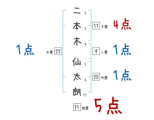 外運![]() | 二本木仙太朗さんの外運は22画の1つ星!努力することが苦手ないっぽう手先が器用。芸術性にも優れる。 生活面を象徴する運勢です。外部から受ける影響力を表し、結婚運、家庭運や職場、環境への順応性を表します。 |