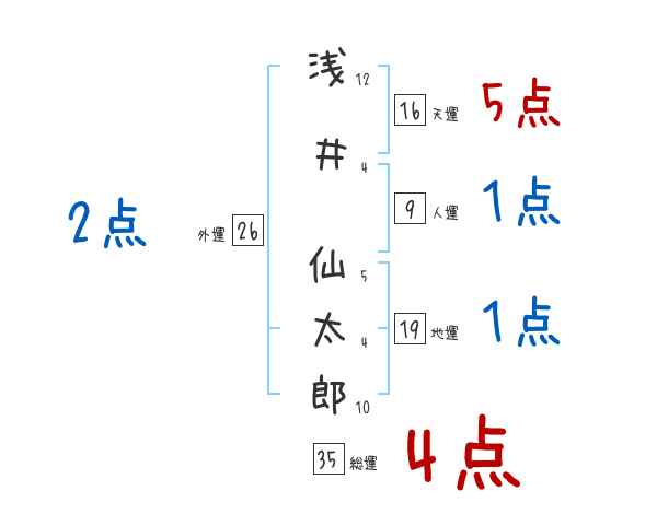外運![]() | 浅井仙太郎さんの外運は26画の2つ星!波瀾万丈かも。信頼できる人を大事にしましょう。 生活面を象徴する運勢です。外部から受ける影響力を表し、結婚運、家庭運や職場、環境への順応性を表します。 |