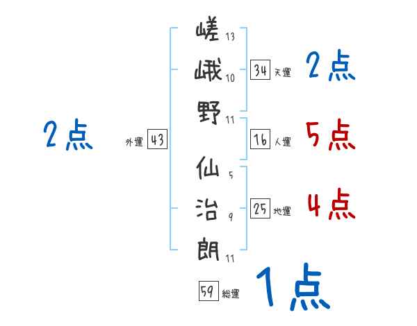 人運![]() | 嵯峨野仙治朗さんの人運は16画の5つ星!人望が厚く大きく発展する。逆転成功が見える。 性格や才能などを表す2番目に重要な運勢です。人間関係や協調性、社会的な成功に影響します。主に20歳から50歳ぐらいまでの中年期の運勢を表します。 |