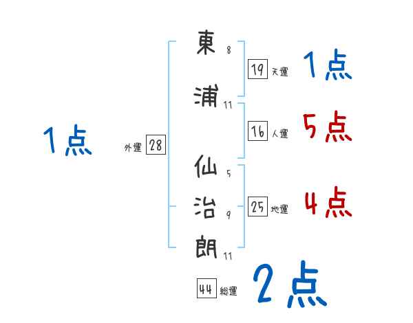 人運![]() | 東浦仙治朗さんの人運は16画の5つ星!人望が厚く大きく発展する。逆転成功が見える。 性格や才能などを表す2番目に重要な運勢です。人間関係や協調性、社会的な成功に影響します。主に20歳から50歳ぐらいまでの中年期の運勢を表します。 |