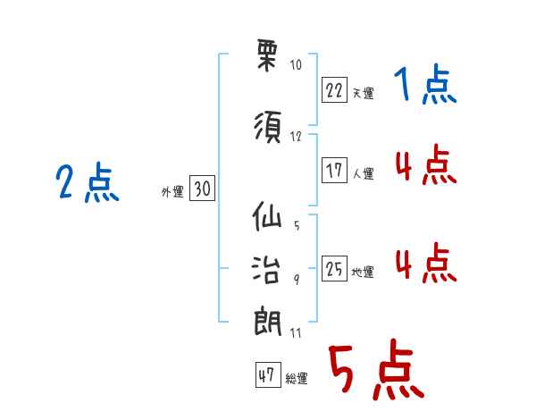 総運![]() | 栗須仙治朗さんの総運は47画の5つ星!実力が開花し発展する円満な人生。財に恵まれる。 あなたの人生を表す1番重要な運勢です。生涯を通じて影響する総合運となり、主に50歳以降の晩年期に影響を及ぼします。 |