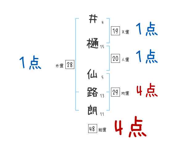 外運![]() | 井樋仙路朗さんの外運は28画の1つ星!家庭環境に注意。スポーツで活躍できる能力があるかも。 生活面を象徴する運勢です。外部から受ける影響力を表し、結婚運、家庭運や職場、環境への順応性を表します。 |