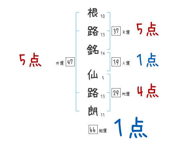 外運![]() | 根路銘仙路朗さんの外運は47画の5つ星!実力が開花し発展する円満な人生。財に恵まれる。 生活面を象徴する運勢です。外部から受ける影響力を表し、結婚運、家庭運や職場、環境への順応性を表します。 |