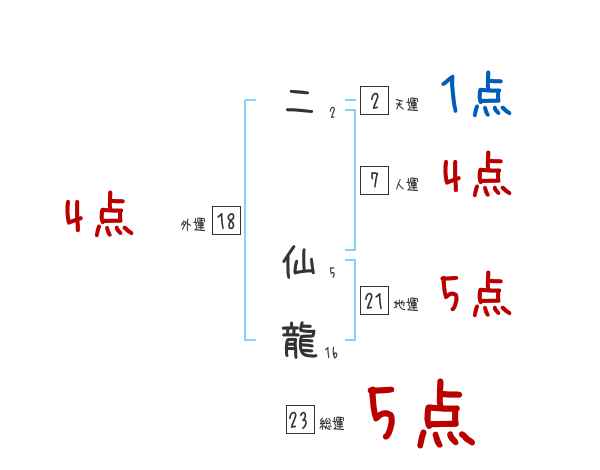 総運![]() | 二仙龍さんの総運は23画の5つ星!想像力に優れ活力がある。一代で成功し名誉を手に入れる。 あなたの人生を表す1番重要な運勢です。生涯を通じて影響する総合運となり、主に50歳以降の晩年期に影響を及ぼします。 |