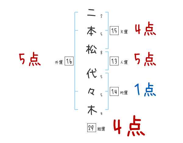 人運![]() | 二本松代々木さんの人運は13画の5つ星!才能に恵まれ人気がある。名声を手に入れる。円満な人生。 性格や才能などを表す2番目に重要な運勢です。人間関係や協調性、社会的な成功に影響します。主に20歳から50歳ぐらいまでの中年期の運勢を表します。 |