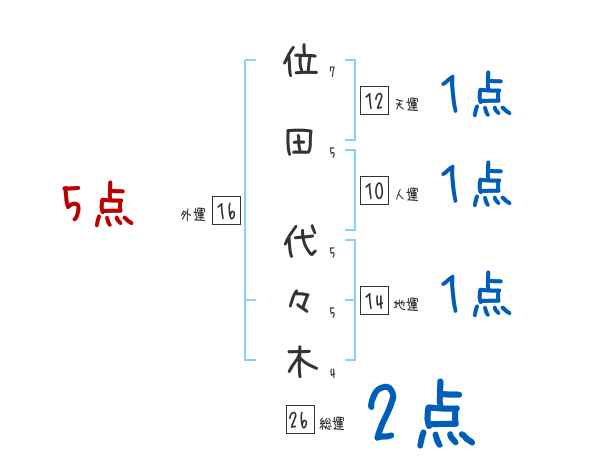 外運![]() | 位田代々木さんの外運は16画の5つ星!人望が厚く大きく発展する。逆転成功が見える。 生活面を象徴する運勢です。外部から受ける影響力を表し、結婚運、家庭運や職場、環境への順応性を表します。 |