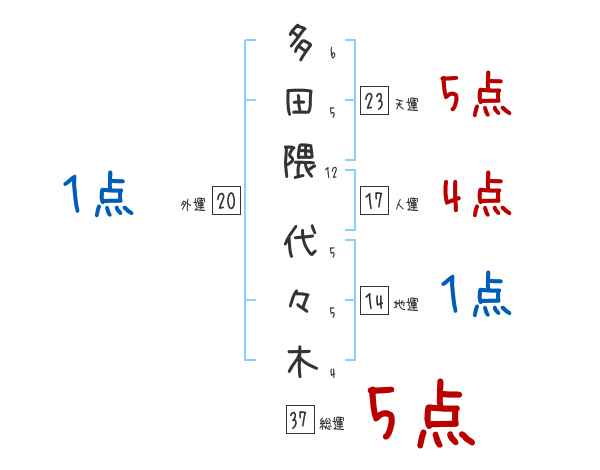 天運![]() | 多田隈代々木さんの天運は23画の5つ星!想像力に優れ活力がある。一代で成功し名誉を手に入れる。 家系が持つ宿命的な運勢を表します。祖先から受け継いだ苗字ですので自分の力が及びません。家柄を象徴します。 |