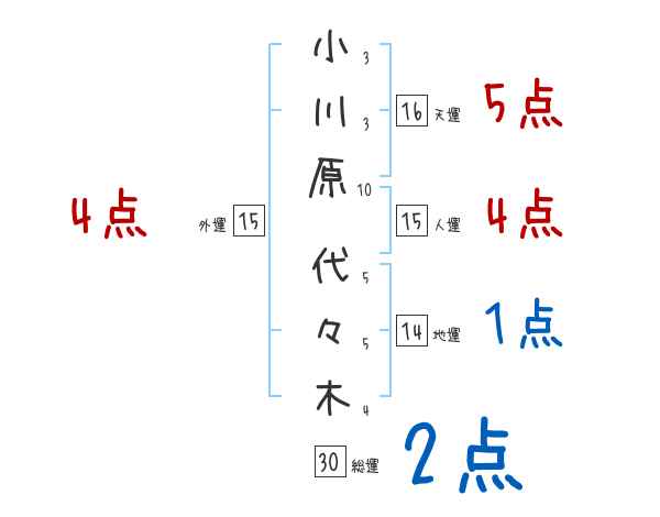 人運![]() | 小川原代々木さんの人運は15画の4つ星!人徳があり出世する。順調に物事を進め円満な人生。 性格や才能などを表す2番目に重要な運勢です。人間関係や協調性、社会的な成功に影響します。主に20歳から50歳ぐらいまでの中年期の運勢を表します。 |