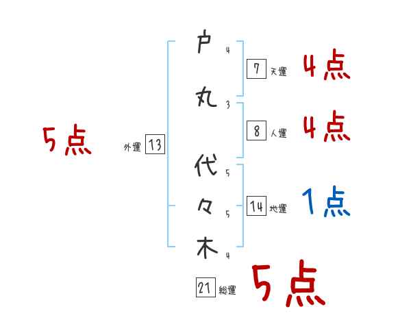 天運![]() | 戸丸代々木さんの天運は7画の4つ星!強い意志や信念を持ち独立心が強い。自立する。 家系が持つ宿命的な運勢を表します。祖先から受け継いだ苗字ですので自分の力が及びません。家柄を象徴します。 |