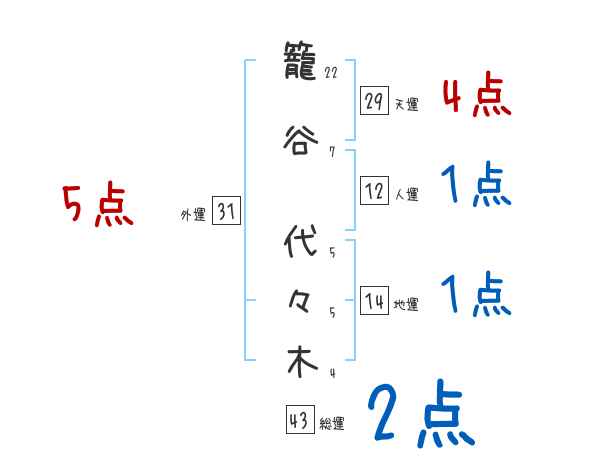 総運![]() | 籠谷代々木さんの総運は43画の2つ星!頑固な性格で独立心が強いかも。やや非現実的で浪費に注意しましょう。 あなたの人生を表す1番重要な運勢です。生涯を通じて影響する総合運となり、主に50歳以降の晩年期に影響を及ぼします。 |