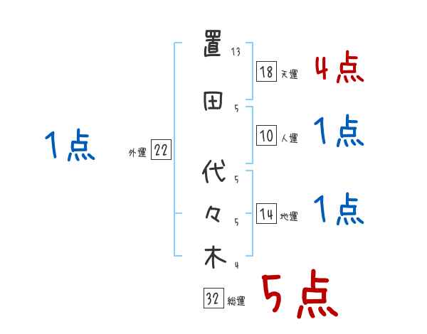 総運![]() | 置田代々木さんの総運は32画の5つ星!柔軟性があり成功する。チャンスが多く金運が良い。 あなたの人生を表す1番重要な運勢です。生涯を通じて影響する総合運となり、主に50歳以降の晩年期に影響を及ぼします。 |