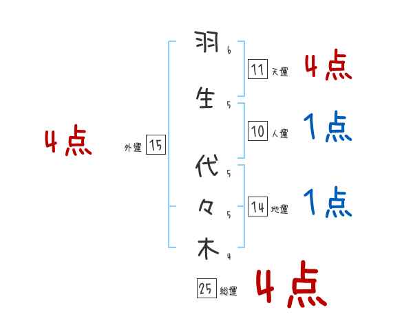 天運![]() | 羽生代々木さんの天運は11画の4つ星!着実に富や地位を得る幸運な人生。 家系が持つ宿命的な運勢を表します。祖先から受け継いだ苗字ですので自分の力が及びません。家柄を象徴します。 |