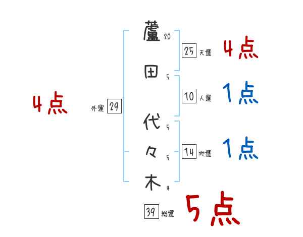 人運![]() | 蘆田代々木さんの人運は10画の1つ星!不安を感じやすい傾向。ストレスを抱えないように注意しましょう。 性格や才能などを表す2番目に重要な運勢です。人間関係や協調性、社会的な成功に影響します。主に20歳から50歳ぐらいまでの中年期の運勢を表します。 |