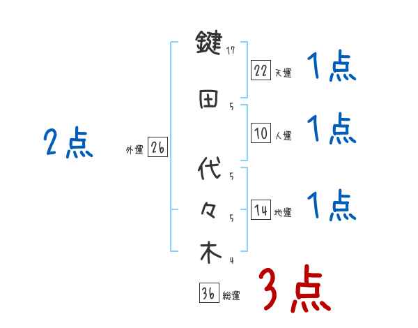 天運![]() | 鍵田代々木さんの天運は22画の1つ星!努力することが苦手ないっぽう手先が器用。芸術性にも優れる。 家系が持つ宿命的な運勢を表します。祖先から受け継いだ苗字ですので自分の力が及びません。家柄を象徴します。 |