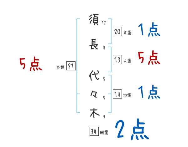 総運![]() | 須長代々木さんの総運は34画の2つ星!独創性に優れるが、自尊心が強く災難に注意しましょう。 あなたの人生を表す1番重要な運勢です。生涯を通じて影響する総合運となり、主に50歳以降の晩年期に影響を及ぼします。 |