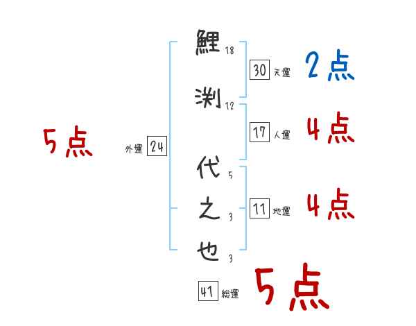 外運![]() | 鯉渕代之也さんの外運は24画の5つ星!家庭運が良く順調な人生。金運にも恵まれる。 生活面を象徴する運勢です。外部から受ける影響力を表し、結婚運、家庭運や職場、環境への順応性を表します。 |