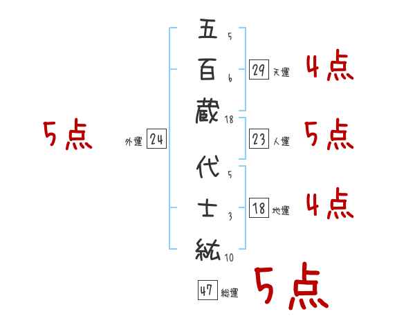 総運![]() | 五百蔵代士紘さんの総運は47画の5つ星!実力が開花し発展する円満な人生。財に恵まれる。 あなたの人生を表す1番重要な運勢です。生涯を通じて影響する総合運となり、主に50歳以降の晩年期に影響を及ぼします。 |