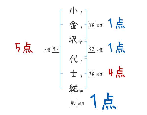 天運![]() | 小金沢代士紘さんの天運は28画の1つ星!家庭環境に注意。スポーツで活躍できる能力があるかも。 家系が持つ宿命的な運勢を表します。祖先から受け継いだ苗字ですので自分の力が及びません。家柄を象徴します。 |