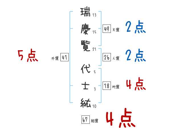 天運![]() | 瑞慶覧代士紘さんの天運は49画の2つ星!不安定な性格で明暗がある人生。周りの人には支援されやすい。 家系が持つ宿命的な運勢を表します。祖先から受け継いだ苗字ですので自分の力が及びません。家柄を象徴します。 |
