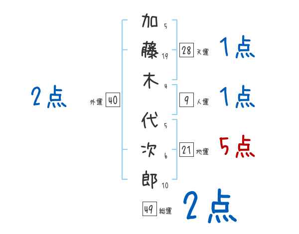 天運![]() | 加藤木代次郎さんの天運は28画の1つ星!家庭環境に注意。スポーツで活躍できる能力があるかも。 家系が持つ宿命的な運勢を表します。祖先から受け継いだ苗字ですので自分の力が及びません。家柄を象徴します。 |