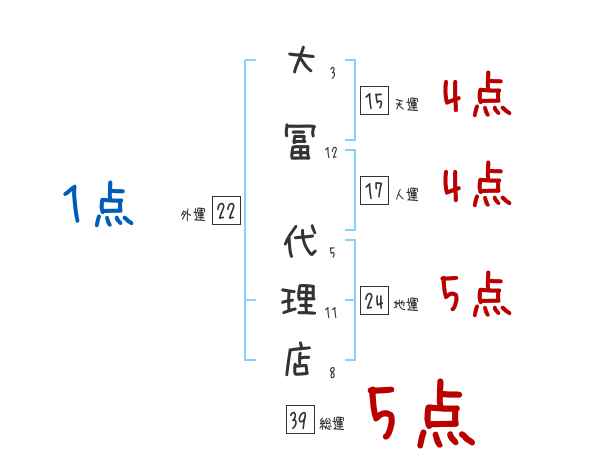 天運![]() | 大冨代理店さんの天運は15画の4つ星!人徳があり出世する。順調に物事を進め円満な人生。 家系が持つ宿命的な運勢を表します。祖先から受け継いだ苗字ですので自分の力が及びません。家柄を象徴します。 |