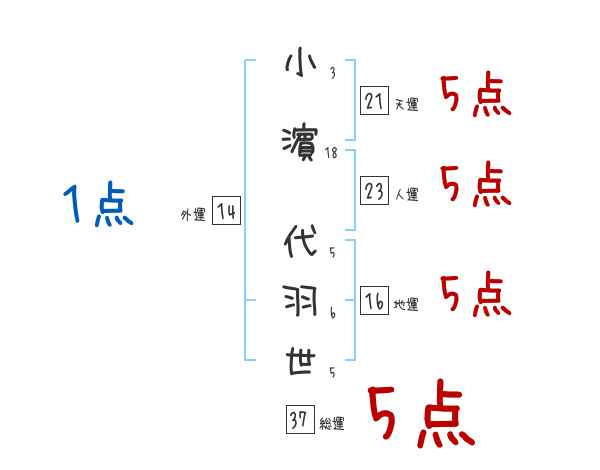 天運![]() | 小濵代羽世さんの天運は21画の5つ星!統率力がある。独立し成功する。名誉を手に入れる。 家系が持つ宿命的な運勢を表します。祖先から受け継いだ苗字ですので自分の力が及びません。家柄を象徴します。 |