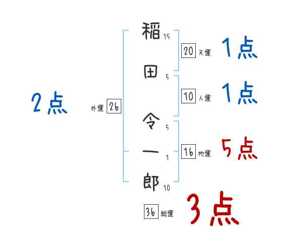 外運![]() | 稲田令一郎さんの外運は26画の2つ星!波瀾万丈かも。信頼できる人を大事にしましょう。 生活面を象徴する運勢です。外部から受ける影響力を表し、結婚運、家庭運や職場、環境への順応性を表します。 |