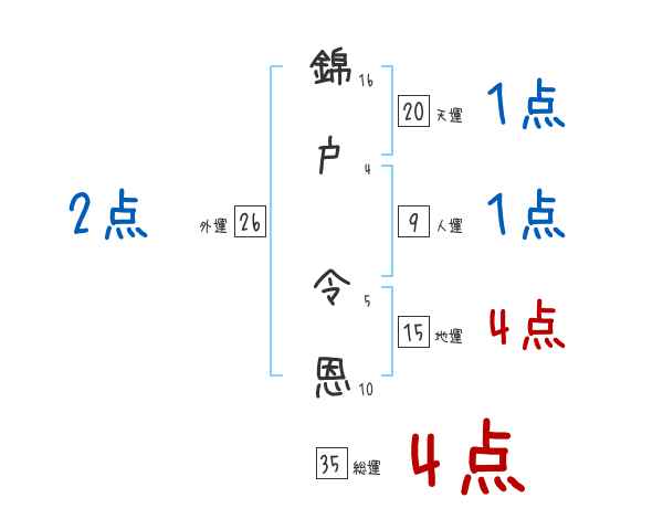 外運![]() | 錦戸令恩さんの外運は26画の2つ星!波瀾万丈かも。信頼できる人を大事にしましょう。 生活面を象徴する運勢です。外部から受ける影響力を表し、結婚運、家庭運や職場、環境への順応性を表します。 |