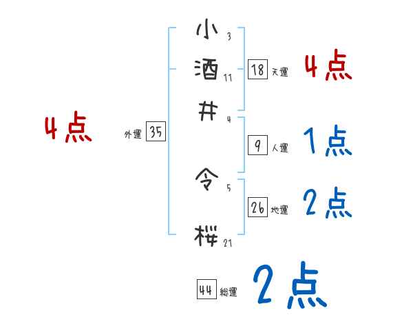 天運![]() | 小酒井令桜さんの天運は18画の4つ星!情熱的で剛気。忍耐力があり信頼される。 家系が持つ宿命的な運勢を表します。祖先から受け継いだ苗字ですので自分の力が及びません。家柄を象徴します。 |