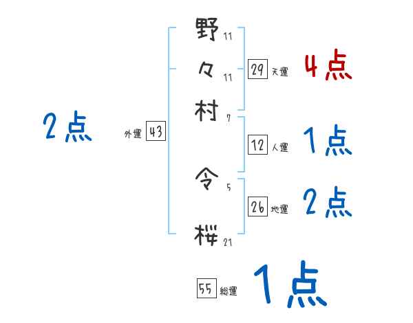 天運![]() | 野々村令桜さんの天運は29画の4つ星!完全主義で才能がある。厳格な心の持ち主。 家系が持つ宿命的な運勢を表します。祖先から受け継いだ苗字ですので自分の力が及びません。家柄を象徴します。 |