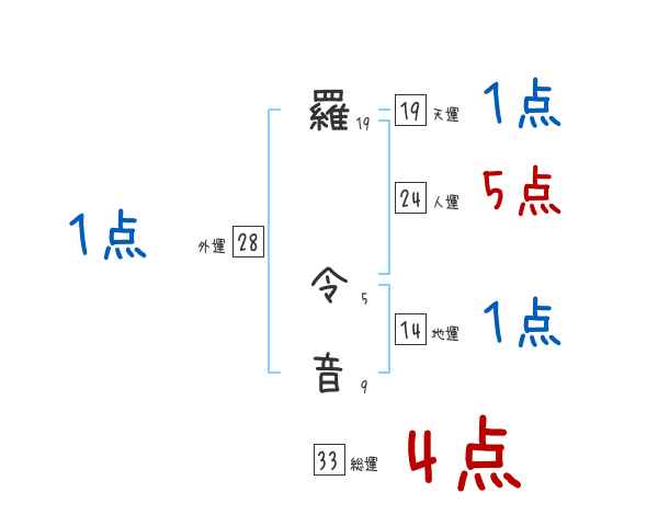 天運![]() | 羅令音さんの天運は19画の1つ星!優れた才能を持ちますが、協調性が足りないことも。周りの人と協力する事を意識しましょう。 家系が持つ宿命的な運勢を表します。祖先から受け継いだ苗字ですので自分の力が及びません。家柄を象徴します。 |