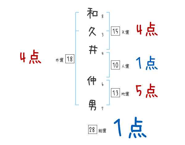 総運![]() | 和久井仲男さんの総運は28画の1つ星!家庭環境に注意。スポーツで活躍できる能力があるかも。 あなたの人生を表す1番重要な運勢です。生涯を通じて影響する総合運となり、主に50歳以降の晩年期に影響を及ぼします。 |