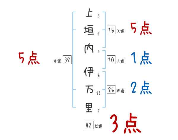 外運![]() | 上垣内伊万里さんの外運は32画の5つ星!柔軟性があり成功する。チャンスが多く金運が良い。 生活面を象徴する運勢です。外部から受ける影響力を表し、結婚運、家庭運や職場、環境への順応性を表します。 |
