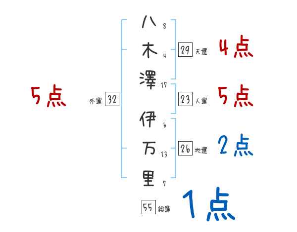 外運![]() | 八木澤伊万里さんの外運は32画の5つ星!柔軟性があり成功する。チャンスが多く金運が良い。 生活面を象徴する運勢です。外部から受ける影響力を表し、結婚運、家庭運や職場、環境への順応性を表します。 |